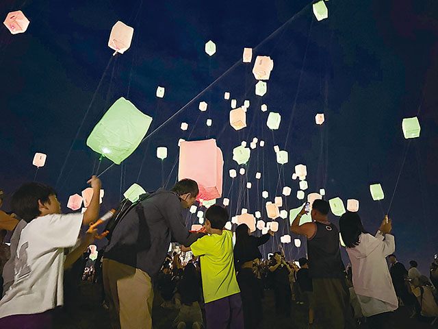 ▲胆振東部地震の犠牲者の冥福を祈り、空に放たれたスカイランタン