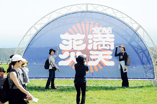 ▲半円状のロゴマークを背景に記念写真を撮る来場者