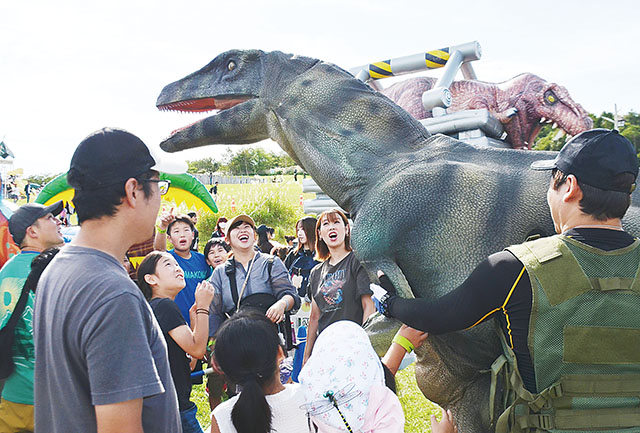 ▲満天遊園地で迫力ある恐竜に歓声を上げる親子連れ